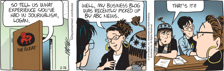 They are all interviewing with Cody, Owen and Les Moore for positions on ‘The Bleat.’ Maris has a blog of make-up tutorials but knows nothing about journalism, Logan has a business blog that ABC news picked up? (The hell?) They all get the spot, and Bernie will, of course, talk about comic books.