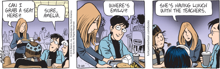 March 29, 2017. In the middle of a week of Becky/Dinkle gags, a single strip where Dinkle addresses the band. Malcom gets the only name he will be known by for the rest of his high school tenure. Bernie, Emily, Amelia, and Connor are also seen.