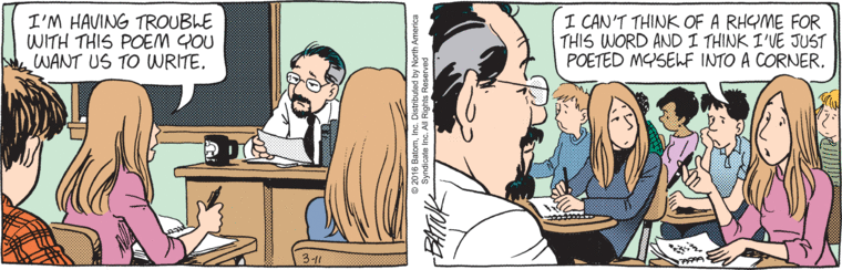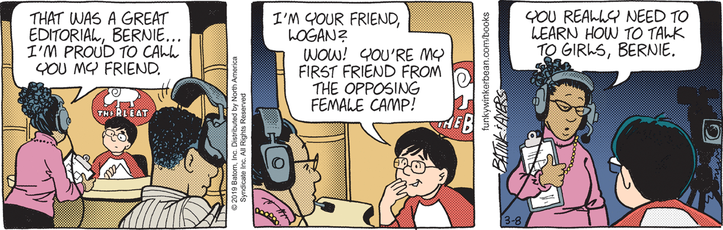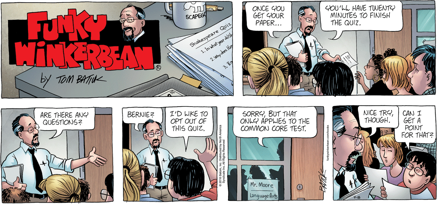 September 18, 2016. A Sunday Strip where Bernie asks if he can opt out of a quiz. Logan, Maris, and maybe Amelia are in the class.