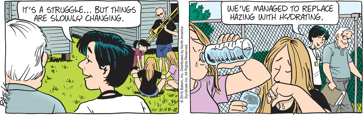 A week of school shenanigans. On May 31, 2017 we get Bernie doing another Batiuk ™ wacky test answer. And June 1, has a poorly drawn Connor talking to a poorly drawn Linda (Burchett had just taken over art duties.) Everything else that week is about the teachers.
