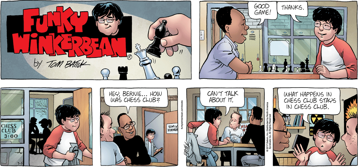 March 5, 2017. A Sunday Strip where Bernie leaves chess club to go play games at Komix Korner with Malcolm and Connor.