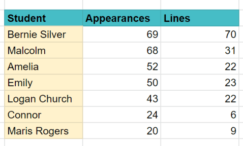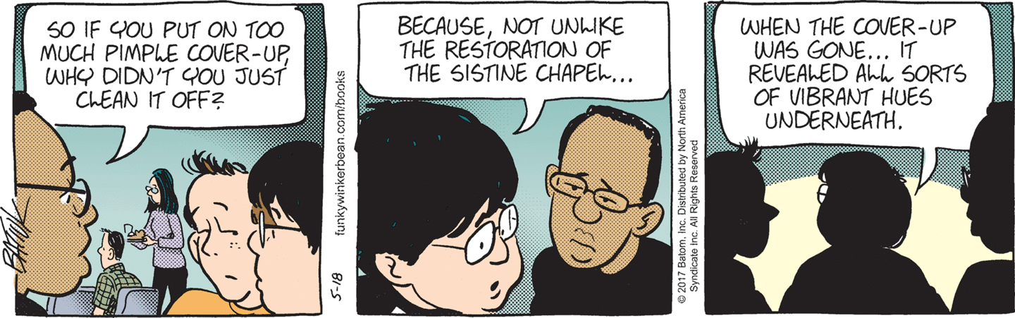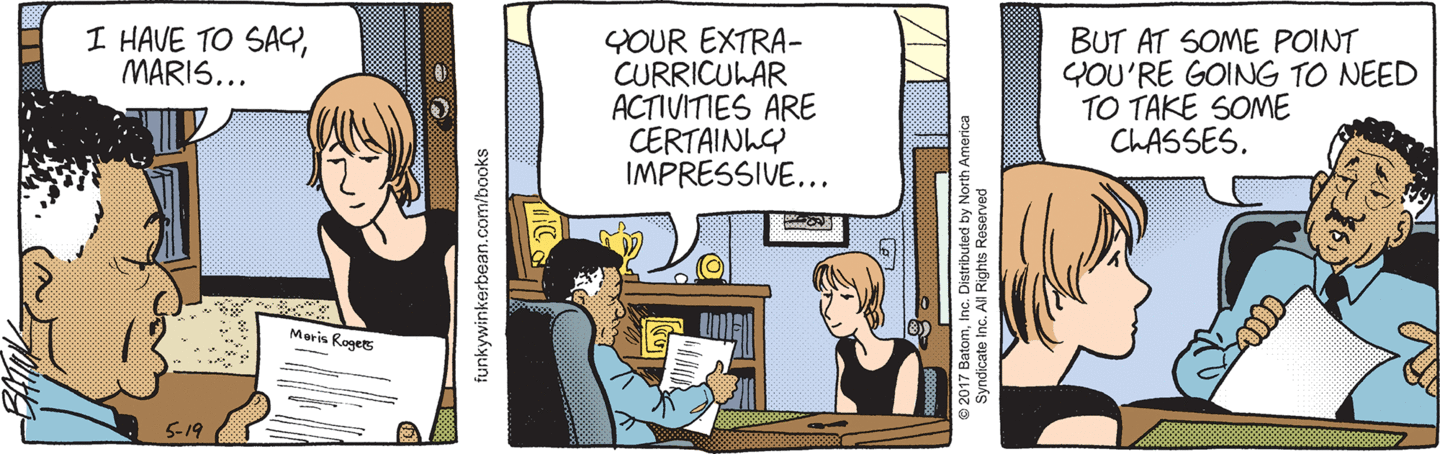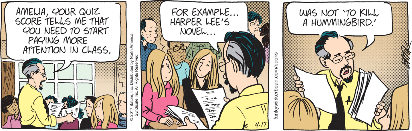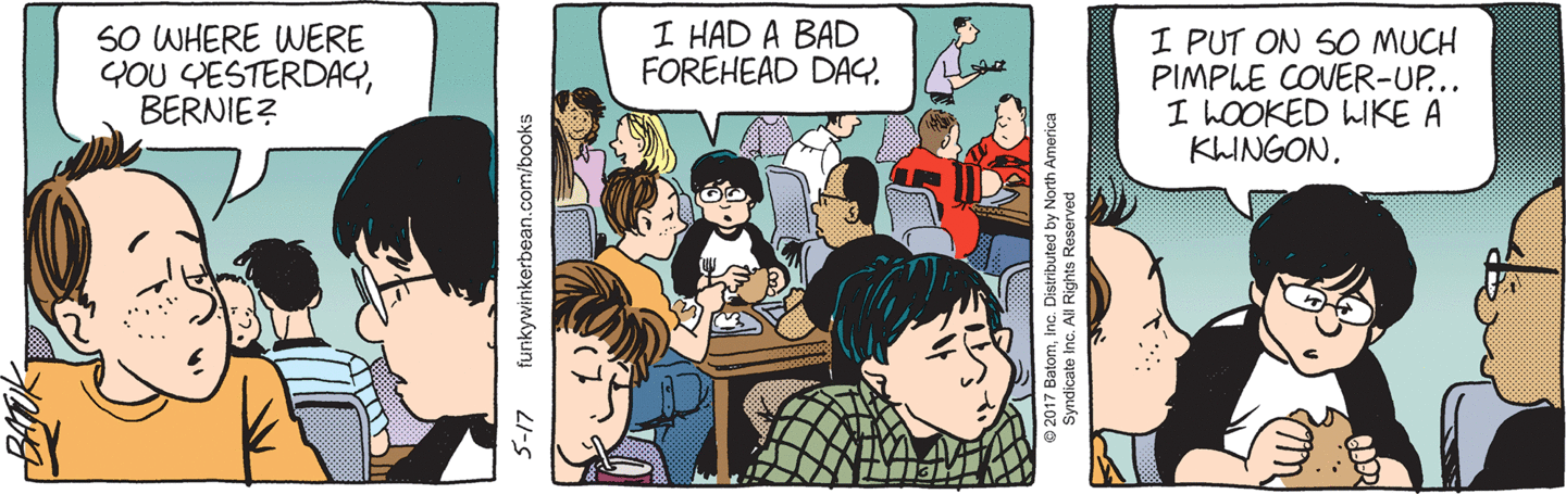 May 16-22, 2017. Another week of high school gags. First Malcolm, Bernie, and Connor at lunch. Then Maris talks to Principal Nate. Finally Les gives a class, including the whole crew, the results of a quiz.