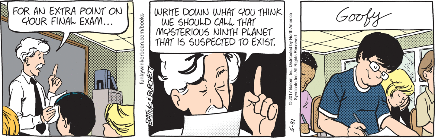 March 29, 2020. A Sunday Strip. Bernie relates New Horizon’s historic flyby with a Marvel character. Connor, Emily, Amelia, Logan, and Malcolm are in class.