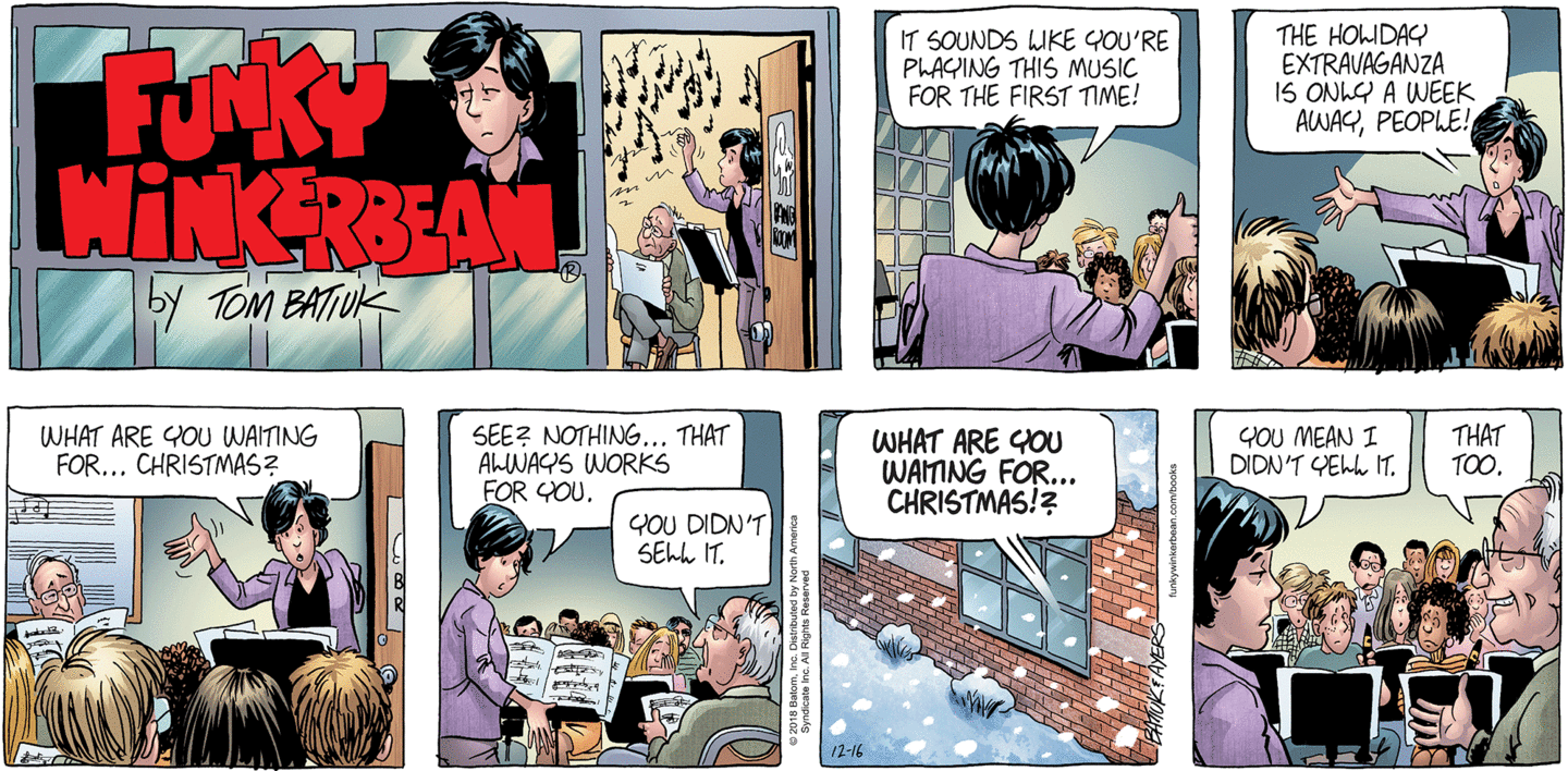 December 23, 2018. A Sunday Strip of the Christmas Concert. Is that Connor’s hair fweep in the second panel? Is that a tiny Amelia in the last? Does it matter? No. Because the strip is about Becky (for once.)