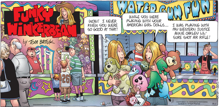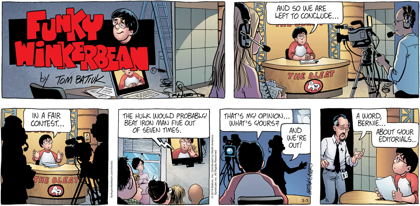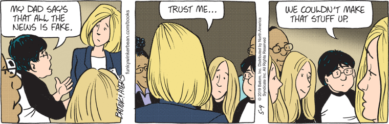 March 17, 2019. A week later, A Sunday Strip, Batiuk pats himself on the back again for the gun violence walkout by having Fred Fairgood watch the entire class walkout again on the news. If you squint you can tell it’s Bernie, Logan, Emily and Amelia leading the class out, and Malcolm, Bernie, and one of the twins on the TV.
