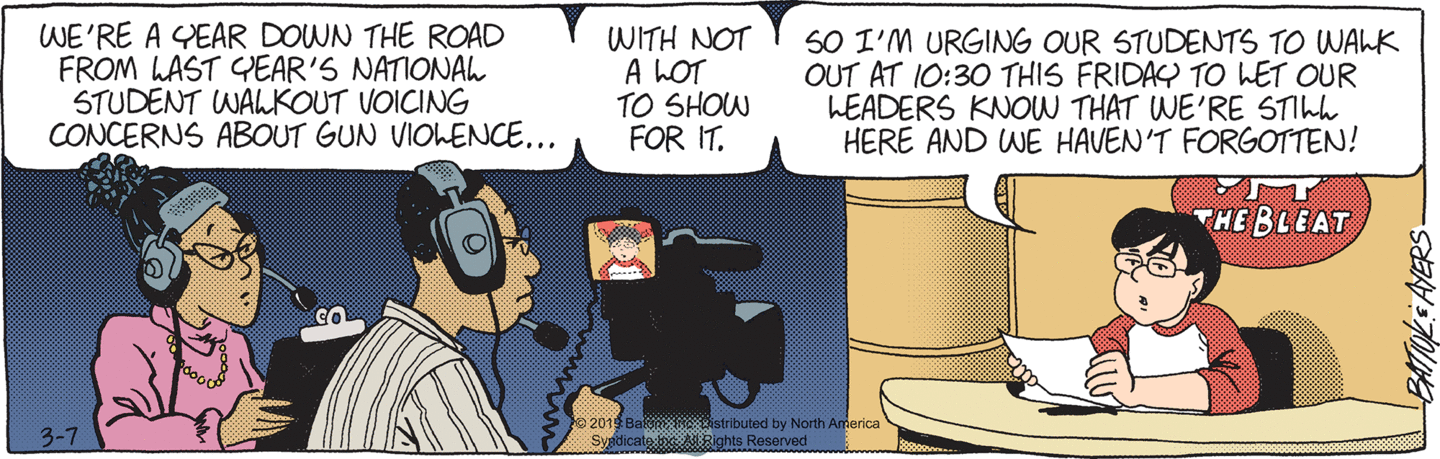 March 3-10, 2019. After a crappy comic editorial, Bernie does a very special gun control editorial. Logan Church compliments him. Logan, Connor, Emily, Amelia, Bernie, Malcolm, and Maris participate in a school walkout.