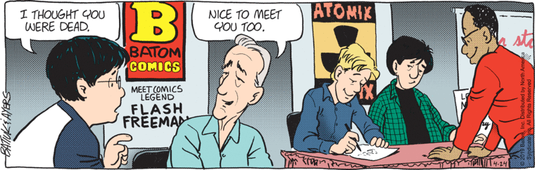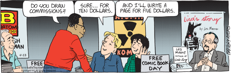 April 2019. During THREE WEEKS of Free Comic Book Day at Komix Korner. Malcolm gets commissioned Darin art. Bernie meets Flash Freeman. Bernie and Malcolm ask about the first appearance of Batton Thomas. Logan, Bernie, and Malcolm get their pictures taken with Masone Jarre and Holtron. Logan gets an autograph to sell. And Malcolm asks about future crossover events at Atomik Komix.