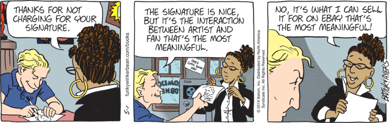 March 8, 2020. A Sunday Strip of Bernie getting a candy bar delivered. Malcolm and Emily are flabbergasted.