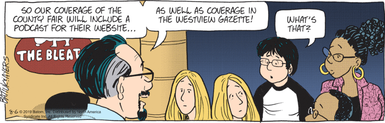 November 3, 2019. A Sunday Strip. Malcolm delivers a bad pun on ‘The Bleat’. Amelia and Logan are camera operator and director.