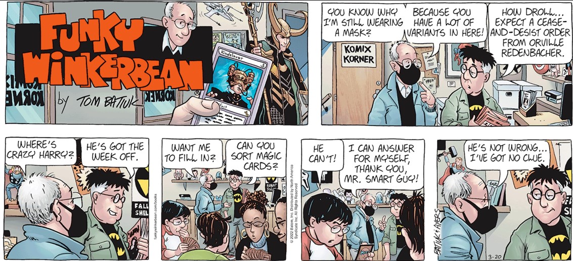 March 20, 2022. A Sunday Strip. Bernie, Malcolm, Logan, and Connor are playing Magic at Komix Korner. Bernie angrily forbids Batton Thomas from sorting Magic cards.
