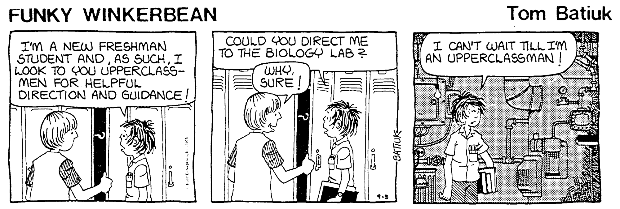 August 26, 2015. 1st appearance of Bernie Silver. Westview seniors Owen and Cody attempt to bully him. He is nonplussed. The next strip they stop when they realize Bernie has a copy of ‘The Amazing Mr. Sponge’ in his backpack.