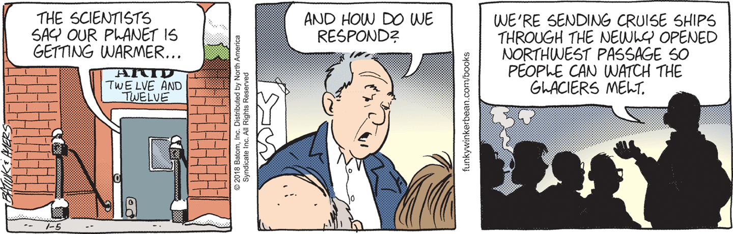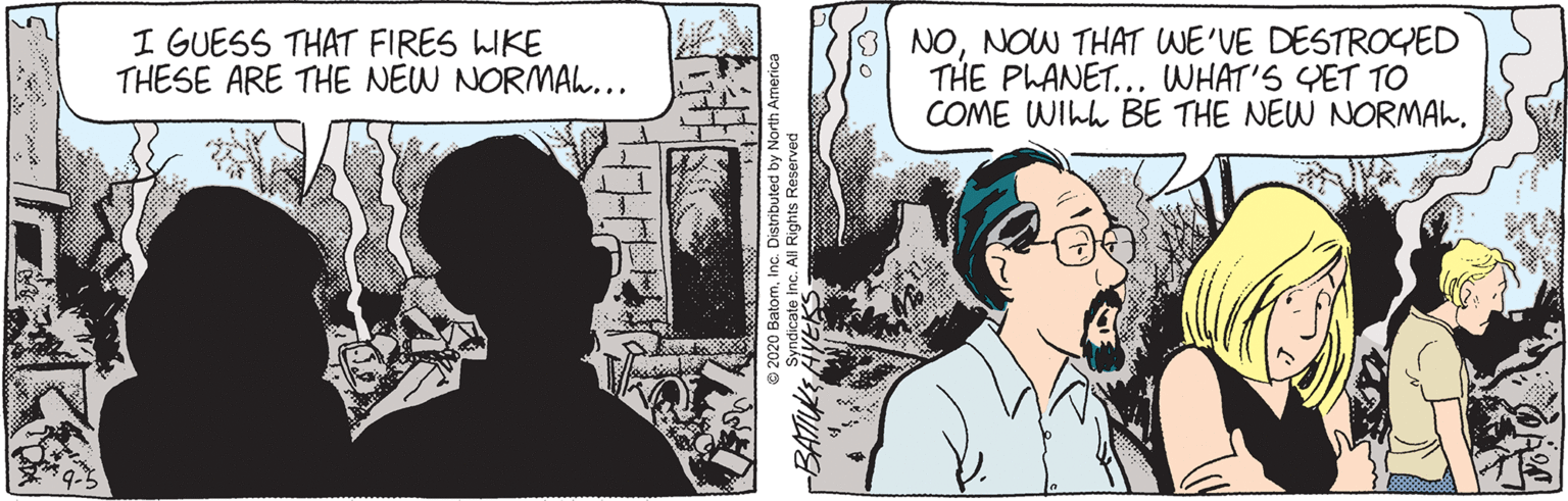 One of the “contemporary issues affecting young adults” that Batiuk depicts “in a thought-provoking and sensitive manner” is climate change. Jim Kablichnick has long been Batty’s go-to mouthpiece, while more recently, Funky and Les each have held forth on this important topic. Now barely three weeks after they’ved developed a personal, subatomic foe for each of their four elemental heroes, Pete hijacks the newly created franchise with a climate change angle, even leveraging his wildfire survivor cred to make his point.