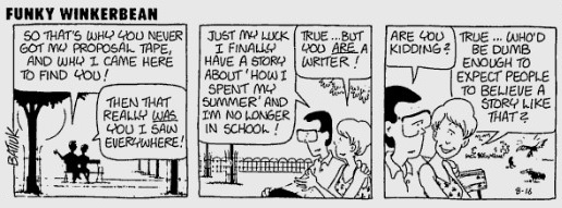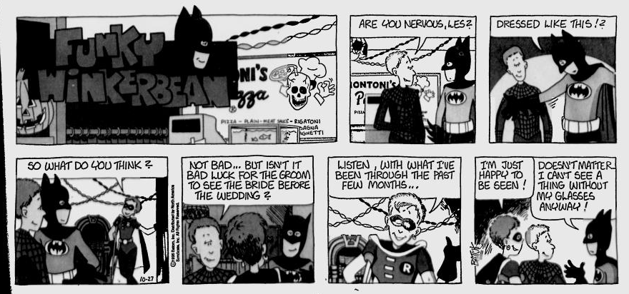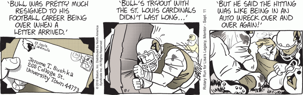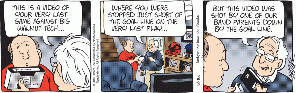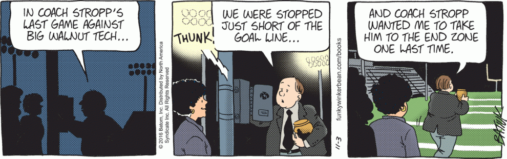 Today’s strip is what passes for levity in Funky Winkerbean these days, I guess. Buck was apparently disturbed by a commonly-milked farm animal when he really should have been disturbed by the complete lack of almost everything at this football game. There appears to be no crowd, no officials, almost no players (look at that empty bench behind Stropp), and apparently no one else but Bull around to wrangle a loose mascot. Was Westview’s football stadium nicknamed “Uncanny Valley”?