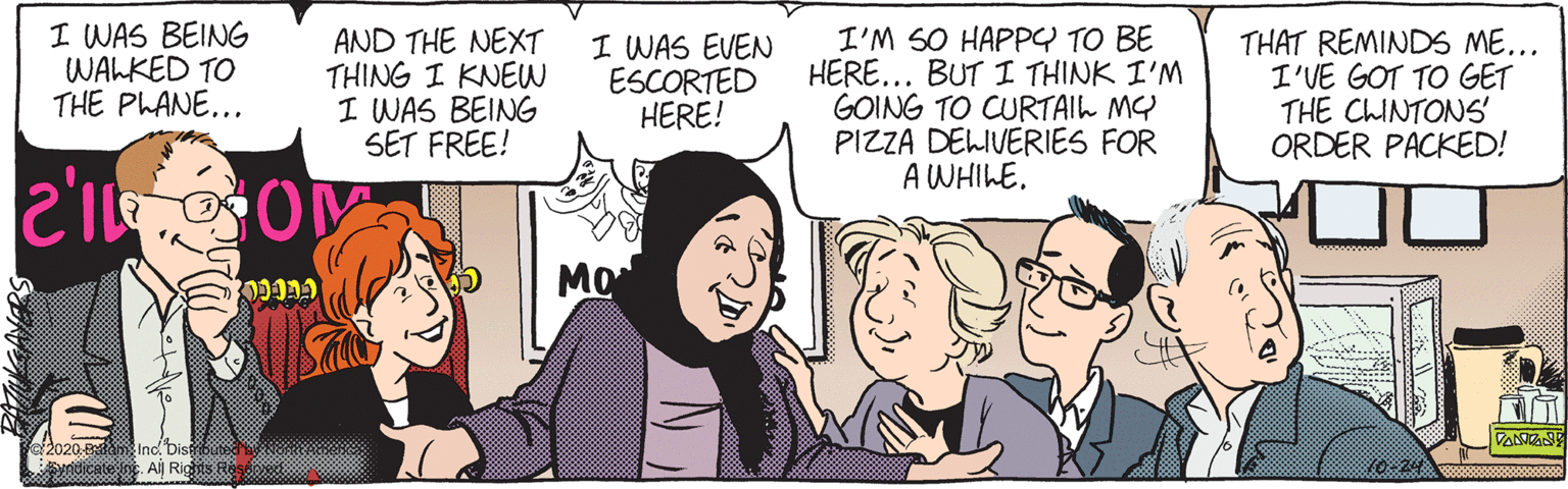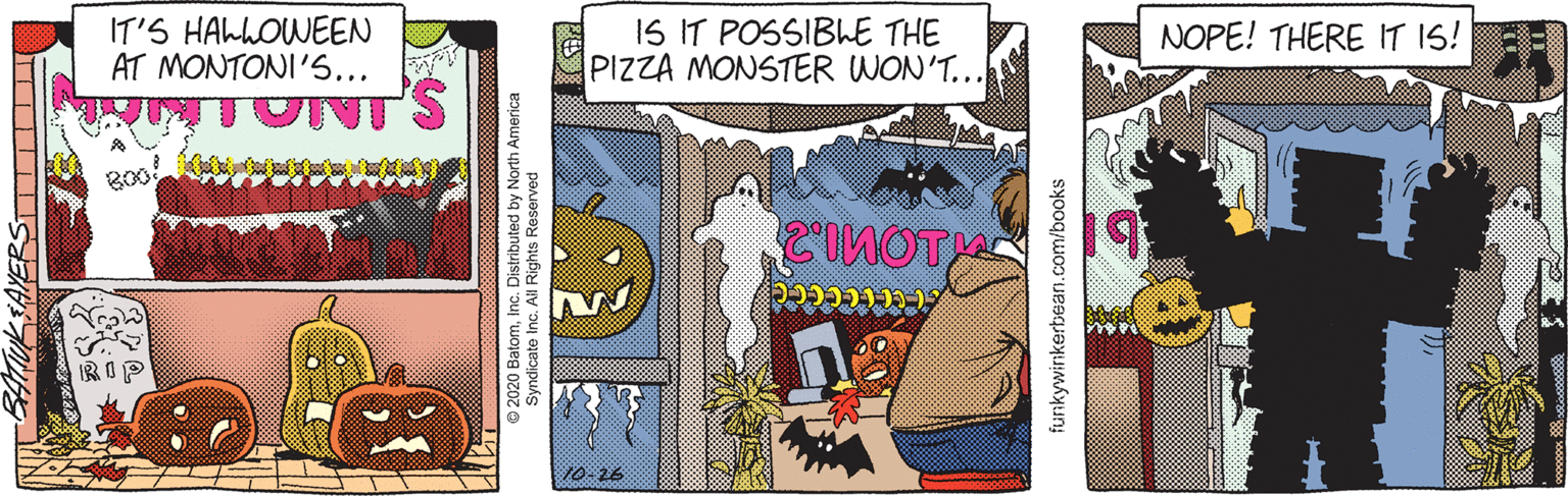 Strips like today’s, where whatever value there might be in the strip would come from the audience being familiar with the recurring “Pizza Monster” and being excited to see it in the strip again, are among the most baffling to me. Even as out of touch as Batiuk is, it seems hard for me believe that even he thinks there are people out there who think Halloween is Pizza Monster in Funky Winkerbean season and are dying to see it come back. It’s not the Great Pumpkin. And most other strips with recurring “gags” like this actually do something different with it each time. With Batiuk’s recurring gags (especially in Crankshaft-Lena’s bad at bowling! Lena’s coffee is terrible! Lena’s brownies are terrible! Crankshaft is buying gardening supplies again!), he thinks that just repeating something over and over is enough.