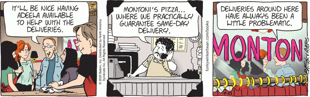 Other than taking place at Montoni’s, I don’t see how “date night” has been “ruined” in any way. Unless the BMV was hundreds of miles away, Wally and Adeela should have gotten back well before any form of “night” started to fall. Perhaps, once back at Montoni’s, Adeela talked and talked forever about how awesome it is to have a driver’s license (which I would not put past any character in this strip), but it should still be late afternoon at most.
