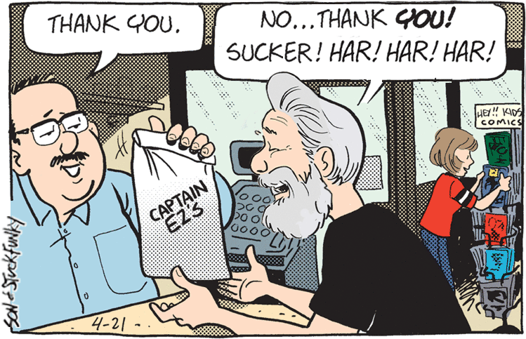 Any time a person or a place in the Funkiverse gets lovingly, weirdly specifically rendered, it sends me down the rabbit hole to investigate. Captain E-Z’s Confectionery, according to an April 15, 2018 story in the Chronicle, stood on Middle Avenue in the Cleveland suburb of Elyria, and was “popular with Elyria High School students for the close proximity it offered to candy, pop and comic books.” On Instagram, I came across an undated image of what appears to be the real place in Ohio. The (poorly taped!) sign in the window advertises milk at $1.55 a gallon, suggesting that this pic dates to circa 1975.