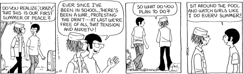 In the midst of this, Batiuk’s strip existed as if in another dimension. His characters were mostly students whose main interests involved air-guitar contests, flaming-baton routines, bullies roaming the hallways, student popularity polls and how to survive the daily humiliations of gym class.