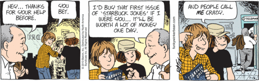 What a weird taunt. “Beat that!” is sufficient…adding “your mileage may vary” suggests that you can score as well or even higher than me, but maybe that phrase was just coming into vogue. Batiuk’s been getting considerable mileage out of sending his Act I characters back in time. It’s been nearly 12 years since Funky’s car accident sent him back to the town square of late ’70’s Westview, where he would encounter his teenaged self as well as his future mate, before checking out the comics spinner rack. Five years later, the entire gang got to meet their middle aged selves (except Lisa LOL) during another month-consuming story arc that was the Time Pool Reunion.