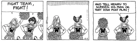 After the early sign gag seemed to have run it course, Wanda disappears for a while. When she comes back, it’s without her sign. Consistent with Batiuk stepping away from edgy activism and into teen-age tropes, she’s now just a big strong girl in overalls.