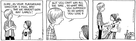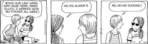 During the second and third summer breaks of the strip, Funky gets a job as a neighborhood playground supervisor. A job that also involves coaching the playground’s baseball team, which appears to be co-ed.