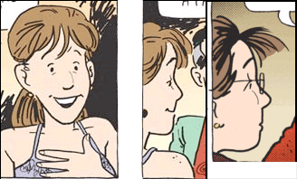 I’m sure you all recognize the delirious kid with the Tarzan comics swirling around his head as young Harold Klinghorn, pre-hat, pre-nickname and pre-drugs, back in those innocent times when his only “high” was Tarzan funnies. The Sunday-strip color gradients and shading do not make him any cuter. We recognize his teenage (and actually likeable) self in the little portrait in the banner. Would anyone not familiar with Funky Winkerbean see today’s comic and figure out that the boy, the kid in the hat, and the old geezer are the same person? Or that the two men talking went to high school together?