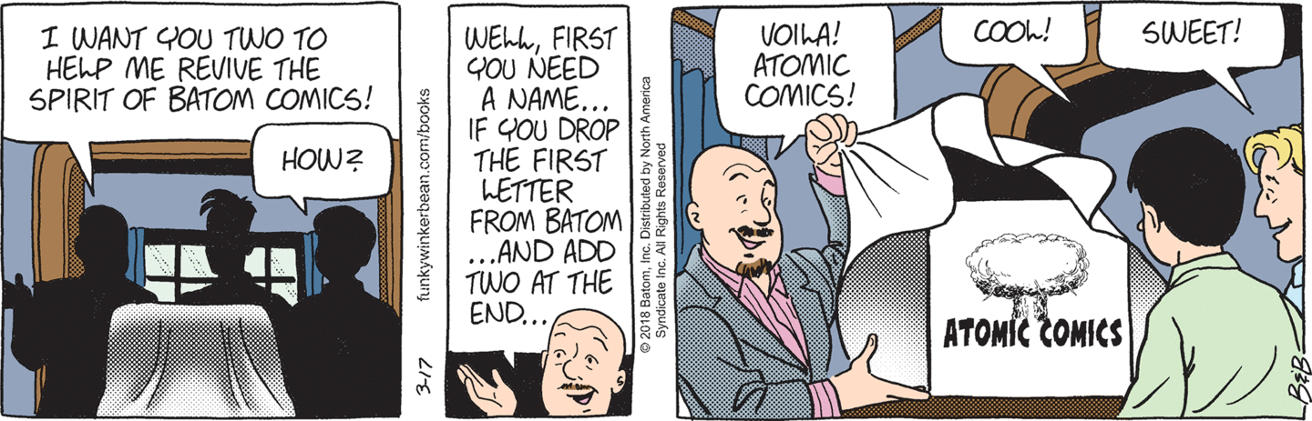 “Batom”…”atom”…”ic”…sure Chester, makes sense to me. I suppose it’s better than “Bamto Comics” or “Tobam Occmis”…albeit not by a whole lot though. I can see the headlines now…