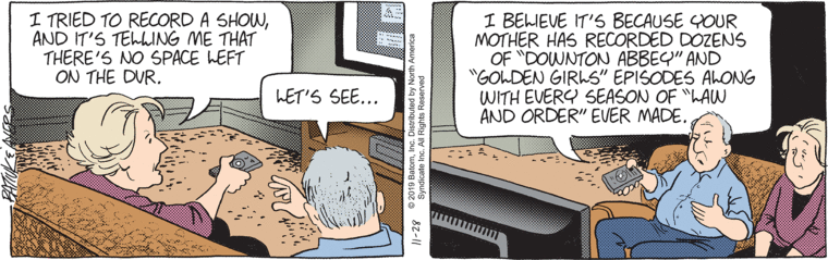 Proof that video technology in the Funkiverse has indeed progressed beyond those VHS tapes that everyone hoards and cherishes. We haven’t even seen Miranda this week, but her trail of destruction extends to every room of the Winkerbean house. In the comments here yesterday,