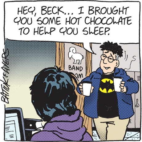 Something we cannot question is this strip’s weird fixation on hot cocoa. Look at Funky lurching compulsively off the couch in search of hot sugar water. I mean, I really only drink the stuff once in a blue moon, usually around Christmas. Westviewians seem to use in all seasons it as some kind of comfort currency. I looked around, but this doesn’t seem to be a specifically Ohio or Great Lakes thing.