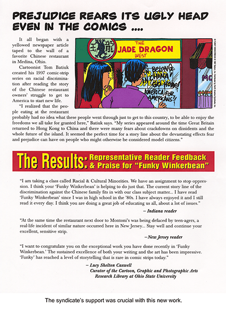 Another story that appeared in 1997 was inspired by a completely different source. A Vietnamese couple had moved to our town and opened a restaurant on the site of a former Red Barn. Cathy and I enjoyed stopping in there, and one time while waiting for an order, I read a yellowed newspaper article that was framed on the wall by the door. It told of the young couple’s escape by boat from Vietnam and the harrowing journey they undertook facing pirates and being stranded and abandoned at sea until finally making it to a hoped-for life of freedom in the United States. I started getting some ideas for a story. One of the advantages of getting ahead on the strip like I had at that juncture was I could take the time to let an idea have a longer gestation period. I could keep rolling it over in my mind, examining all of the facets and considering various possibilities until I felt it was ready. And when it was, a young Chinese couple moved into the space next door to Montoni’s and opened a restaurant called the Jade Dragon West. Zhang Li and his wife Liu Lin were political dissidents from Hong Kong who, fearing a crackdown when Great Britain handed Hong Kong back over to China, made the decision to escape to America. They met their good neighbors Tony Montoni and Funky Winkerbean, but soon the couple also experienced the racism that lurks in the American shadows. In the course of telling their story, I made use of a number of elements of the tale I found in the yellowed newspaper clipping (I seriously doubt if that would have happened with Grubhub, and I’m glad that the nascent internet hadn’t grown big enough to ruin that opportunity for me). Go out to dinner . . . come home with a story. Nice when life works that way.