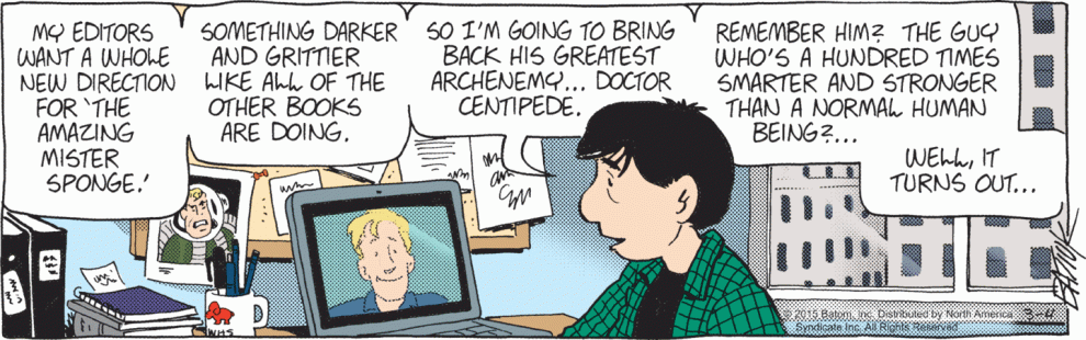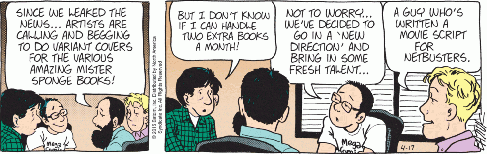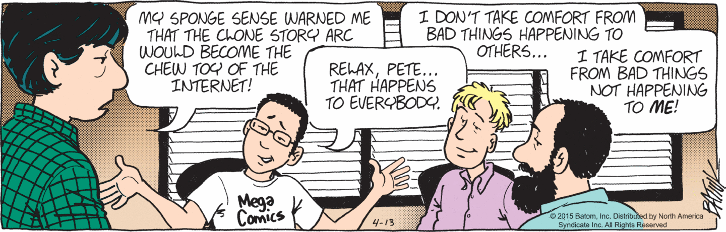 Sure, the editors tasked him with taking Mister Sponge in a “darker and grittier” direction, but the clone idea was Pete’s own, and he enthusiastically sold it to his bosses. When, as they anticipated, controversy ensues, his editors reassure Pete that his story has “lit up the internet” and put sales of their comic book “over the moon.” They outline a plan (presumably involving Pete) to further boost revenue by spinning the one title into three. When Pete predictably complains about the increased workload (his current output is already enough to trigger Pete’s psychoses), his nerdbosses calmly throw him overboard in favor of the Netbusters guy.