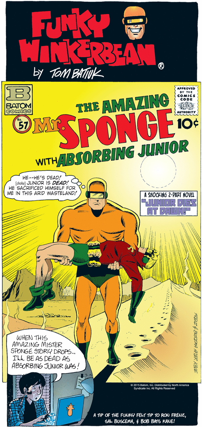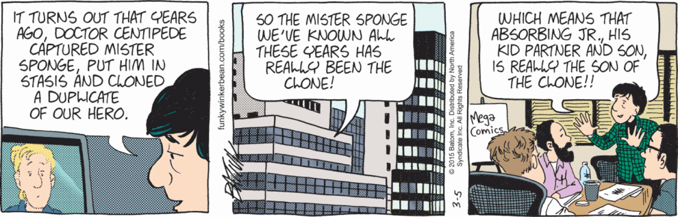 Suddenly jobless and 400 miles from home, Pete is concerned not for himself but for the “poor readers,” represented by Owen in a panel 3 which presumably takes place months hence: the same Owen who was devastated to learn that his absorbent and yellow and porous hero had been “retcloned” has dutifully shelled out for all three of the resulting comics and pronounces them “cool.”
